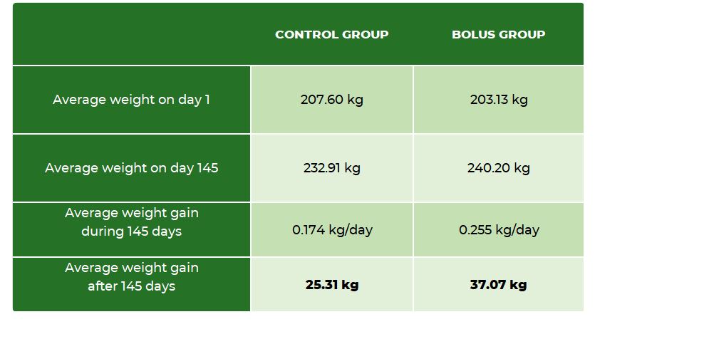 In a period of 145 days, the control group gained 25,31 kg. The group that received the Tracetop Junior however gained 46% more: 37,07 kg. The result, a 12,26 kg difference, is due to a permanent, guaranteed and prolonged supplementation thanks to the Tracetop Junior which works with slow-release technology.